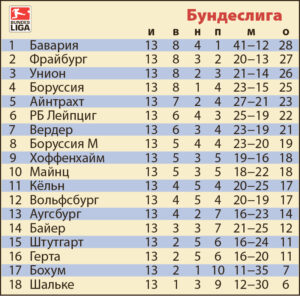 13-й тур. Боруссия М – Штутгарт – 3:1, Боруссия Д – Бохум – 3:0, Майнц – Вольфсбург – 0:3, Хоффенхайм – РБ Лейпциг – 1:3, Аугсбург – Айнтрахт – 1:2, Герта – Бавария – 2:3, Вердер – Шальке – 2:1, Байер – Унион – 5:0, Фрайбург – Кёльн – 2:0.